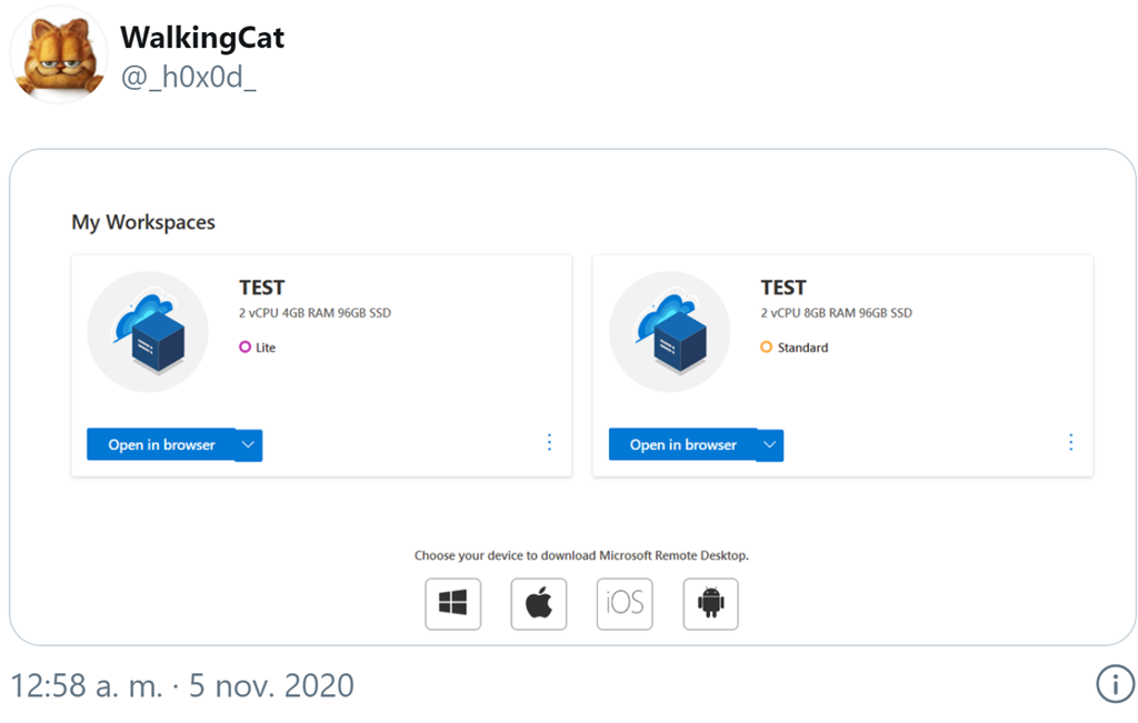 Pero WalkingCat ha revelado más cosas. En primer lugar, capturas de pantalla de una versión funcional de las webs en cuestión, en las que podemos ver los citados espacios de trabajo ya activos y sus características técnicas, y comprobar que conectarnos a los mismos requerirá de la descarga e instalación de Microsoft Remote Desktop.