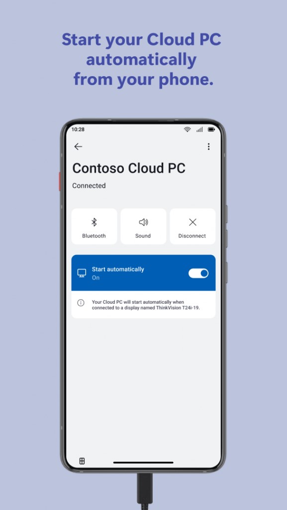 Esta función configura de manera automática sus pantallas para una conexión perfecta a su PC en la nube elegida. Opten por «Guardar credenciales» la primera vez que inicien sesión en su Cloud PC e inicien su Cloud PC de manera instantánea cuando conecten el teléfono a su pantalla de trabajo o de casa.