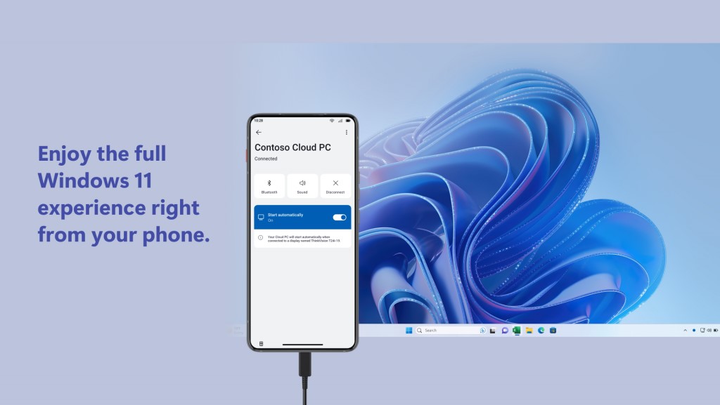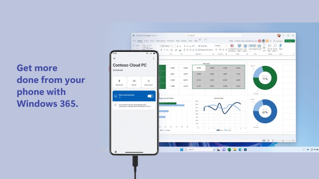 Con la experiencia de aplicación mejorada de Windows 365, pueden acceder a sus aplicaciones favoritas en su teléfono inteligente mientras trabajan en la PC en la nube en la pantalla conectada. Ya sea que necesiten hacer llamadas, enviar y recibir mensajes o consultar sus feeds de redes sociales, pueden hacerlo todo sin interrumpir sus flujos de trabajo en su sesión de PC en la nube. Podrán equilibrar con facilidad su trabajo y sus tareas personales sin perderse ni un solo momento.