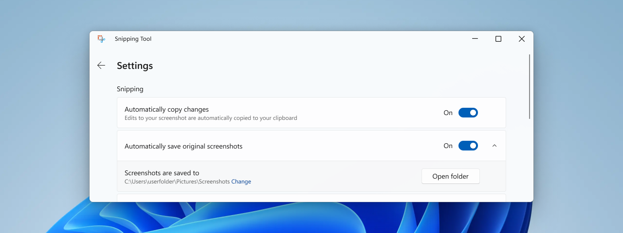 Estamos implementando una actualización para la herramienta Recortes (versión 11.2408.13.0 y posteriores) para los miembros de Windows Insider en los canales Canary y Dev que presenta la posibilidad de cambiar la carpeta en la que se guardan automáticamente las capturas de pantalla y grabaciones de pantalla originales. ¡Solo tienes que ir a la configuración de la aplicación en la herramienta Recortes para seleccionar una nueva carpeta predeterminada y probarla!
