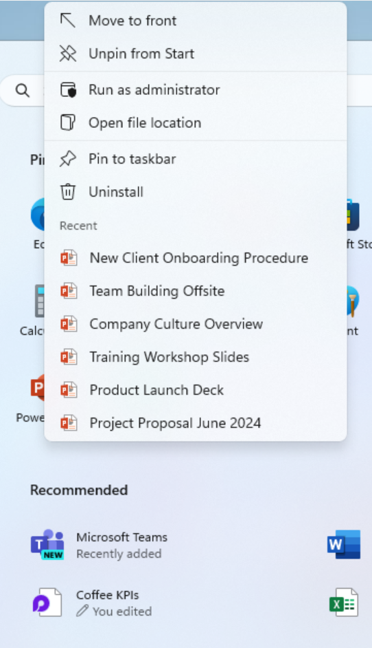 - Al hacer clic derecho en las aplicaciones ancladas al menú Inicio, se mostrarán listas de acceso directo para las aplicaciones que las tengan, como PowerPoint.