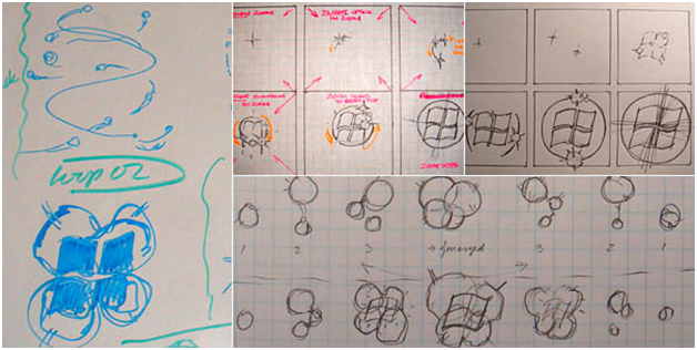 Más de dos docenas de secuencia de arranque diseños fueron creados, revisados, y de los usuarios para evaluar la prueba en contra de nuestros objetivos. Diseños variados en la saturación y / o el brillo del color, la complejidad del movimiento, y efectos de iluminación. Aquí hay algunos bocetos del diseño de nuestro viaje: