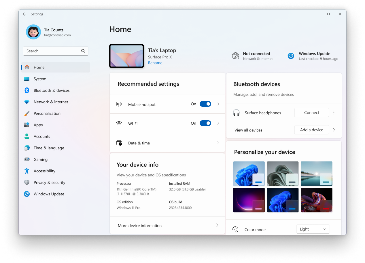 Estamos empezando a implementar la página principal de Configuración para clientes comerciales en PC administrados por un administrador de TI. Esta función mostrará algunas tarjetas existentes relevantes para PC administrados por empresas, como “Configuración recomendada” y “Dispositivos Bluetooth”, así como dos nuevas tarjetas de información del dispositivo y preferencias de accesibilidad específicas para empresas. Para los clientes comerciales que también usan su cuenta Microsoft en su PC administrado, también habrá una nueva tarjeta de cuentas que indica la presencia de cuentas profesionales, educativas y Microsoft. Estamos empezando a implementar esto gradualmente, siendo los PC administrados comerciales que tienen cuentas profesionales, educativas y Microsoft los primeros en ver esta experiencia.[ACTUALIZACIÓN 13/2] Desactivaremos temporalmente la página de inicio de Configuración para clientes comerciales en PC gestionadas por un administrador de TI. Planeamos solucionar algunos problemas y volver a implementarla en una próxima versión.