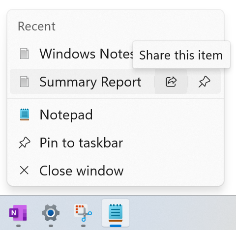 - Estamos implementando la capacidad de compartir archivos directamente desde las listas de salto en la barra de tareas, que aparece cuando hace clic derecho en una aplicación con una lista de salto como el Bloc de notas en la barra de tareas.