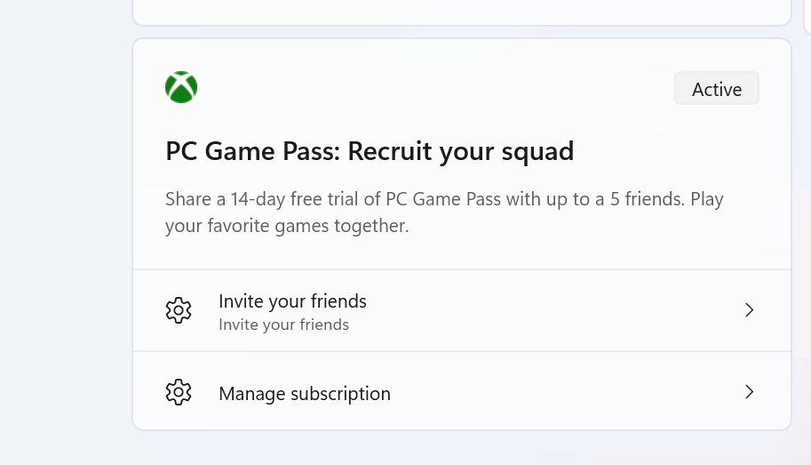 - Los suscriptores de Game Pass Ultimate y PC Game Pass que accedan a la página de Configuración verán una nueva tarjeta para recomendar una suscripción a PC Game Pass a sus amigos y que la prueben gratis. Esta nueva tarjeta solo aparecerá en la página de Configuración si inicias sesión en tu PC con tu cuenta Microsoft y cumples los requisitos.