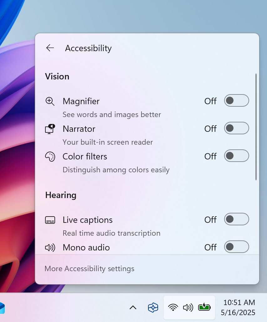 Además de la nueva agrupación del menú desplegable de Accesibilidad en la configuración rápida, estamos agregando descripciones de texto para las tecnologías de asistencia como Narrador, acceso por voz, etc. para facilitar la identificación y el aprendizaje por parte de los usuarios.