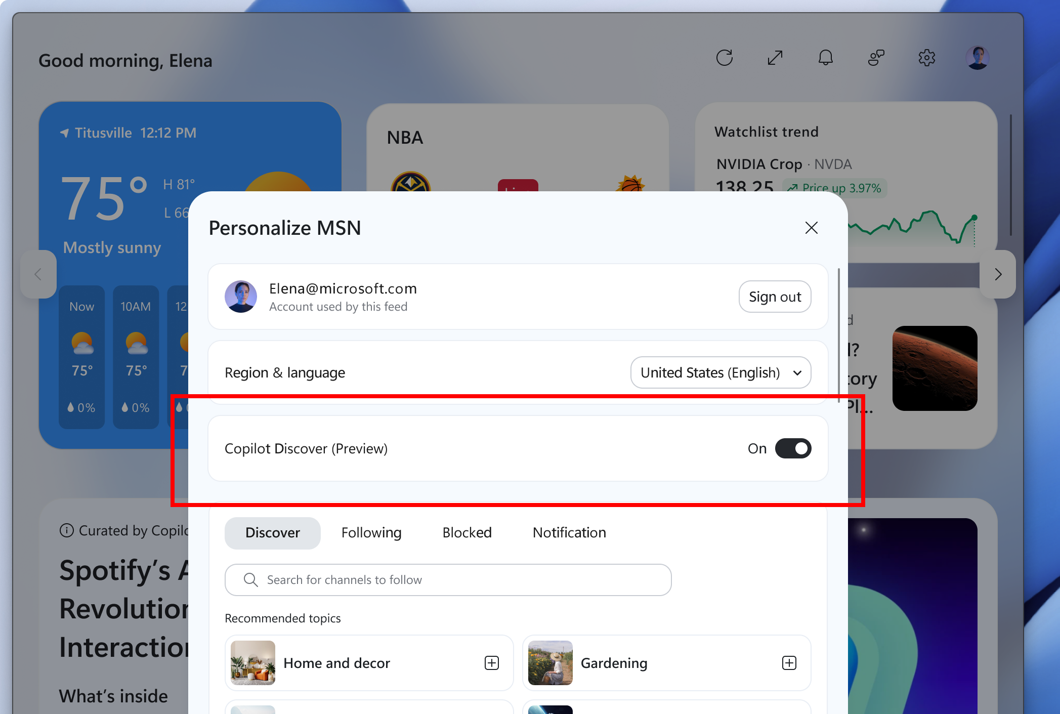 Puede optar por regresar a la experiencia anterior del tablero de widgets, cambiando el interruptor ‘Copilot Discover (Vista previa)’ en el cuadro de diálogo Personalizar configuración de MSN (que se muestra a continuación).