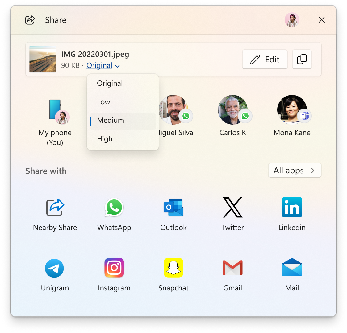 En la ventana para compartir de Windows, como parte de la capacidad de editar y mejorar rápidamente las imágenes mientras se comparten, hemos ajustado la interfaz de usuario para que ahora pueda seleccionar su escala de compresión entre Calidad Alta, Media o Baja, en lugar de elegir entre una escala completa que va de 0 a 100.