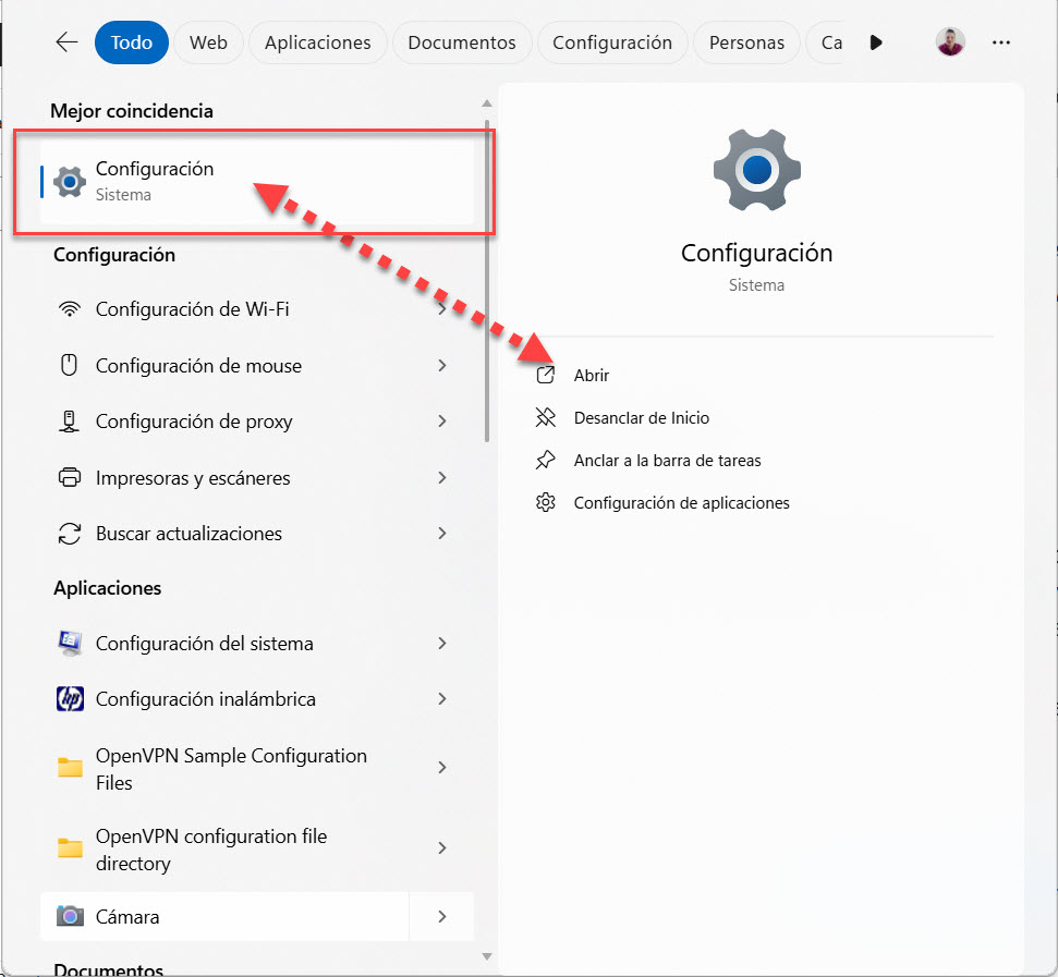 - Utiliza el buscador de la barra de tareas para acceder a la “Configuración” de Windows 11, o bien presiona las teclas “Windows + I”.
