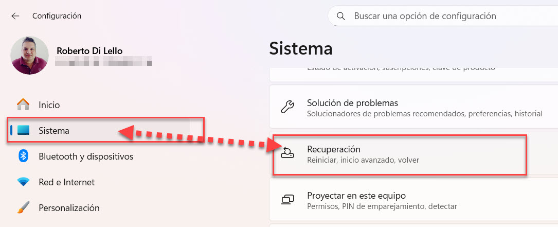 - Ingresa en “Sistema” y luego clica en “Recuperación”.