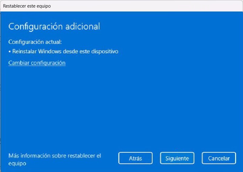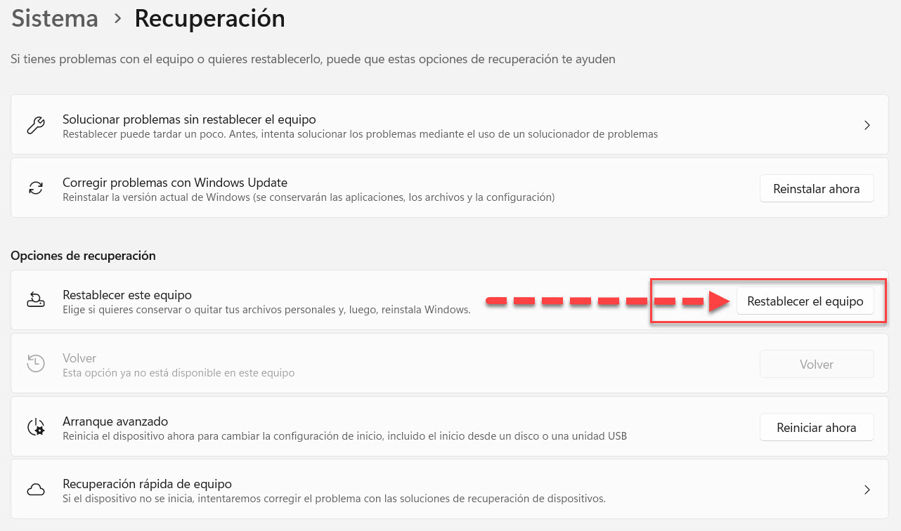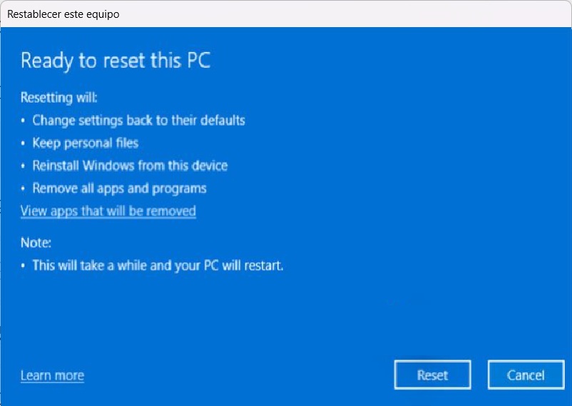 - Por último, hacemos clic en el botón “Reset” para que se restablezca Windows 11. No se asustem si lo ven en otro idioma, puede ser que su Windows de base este en ingles y luego tenga un Language pack, como en mi caso.