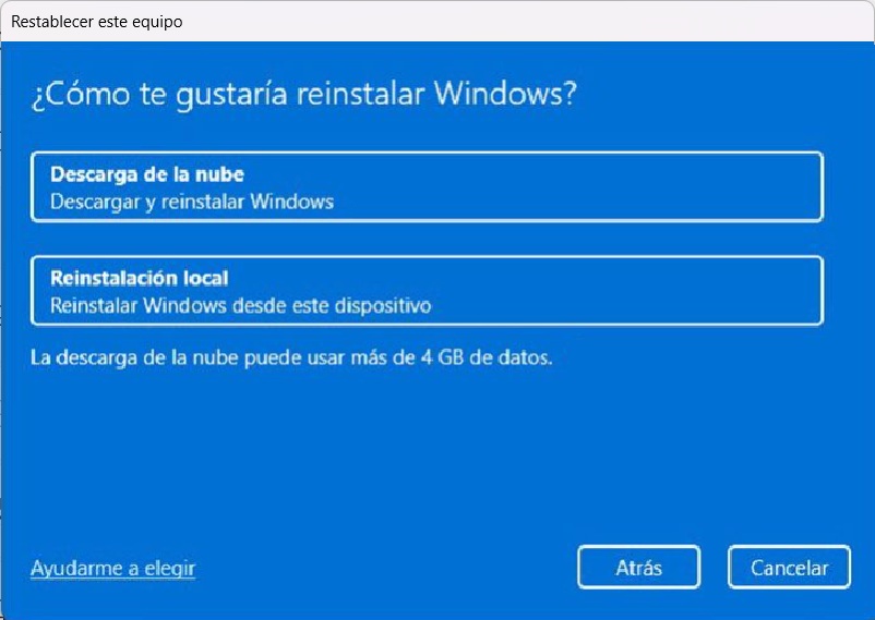 - Seleccionamos si reinstalamos Windows desde la nube o desde un dispositivo local: