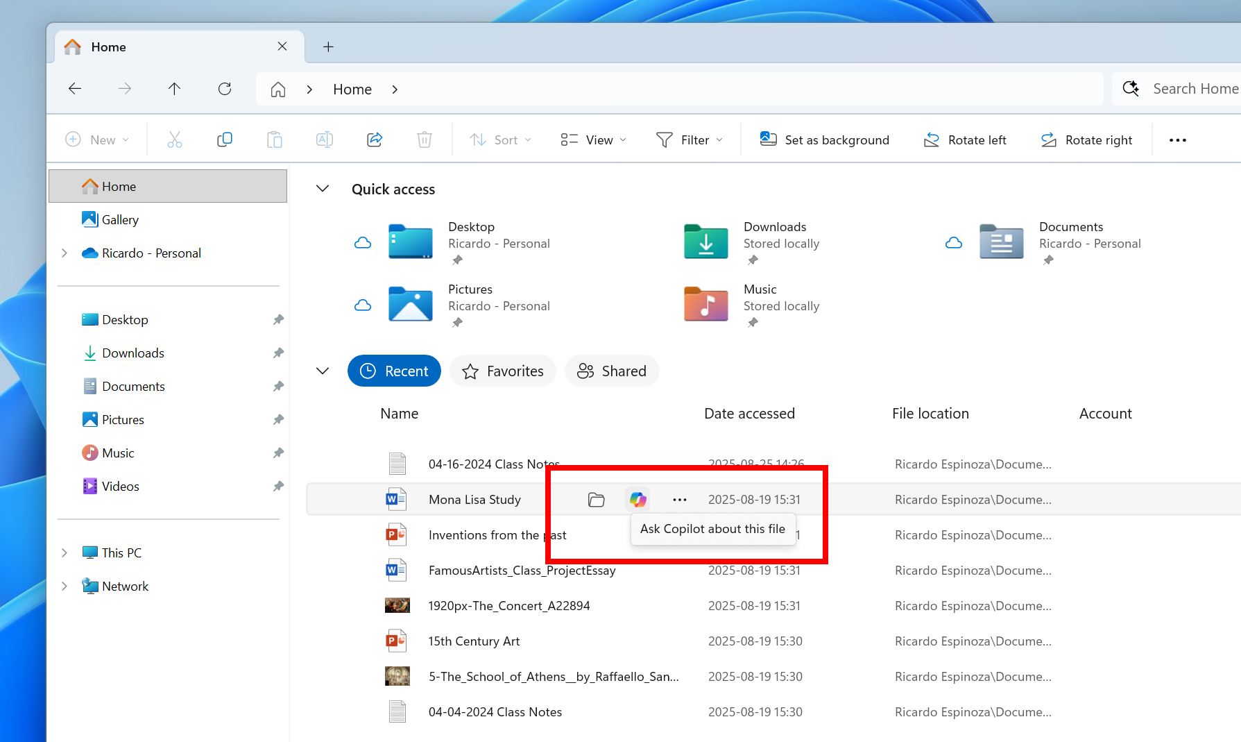 - La página principal del Explorador de archivos ahora ofrece acciones al pasar el cursor para una gestión de archivos más rápida. Al pasar el cursor sobre un archivo en la página principal del Explorador de archivos, se mostrarán comandos como ” Abrir ubicación del archivo” y “Preguntar a Copilot sobre este archivo”. Podrá probar la integración con Copilot y adjuntar archivos fácilmente. Esta experiencia solo funciona actualmente si ha iniciado sesión con una cuenta Microsoft. La compatibilidad con cuentas profesionales o educativas (ID de Entra) estará disponible en una próxima versión. Este cambio aún no se ha implementado para los usuarios de Windows Insider en el EEE (Espacio Económico Europeo).