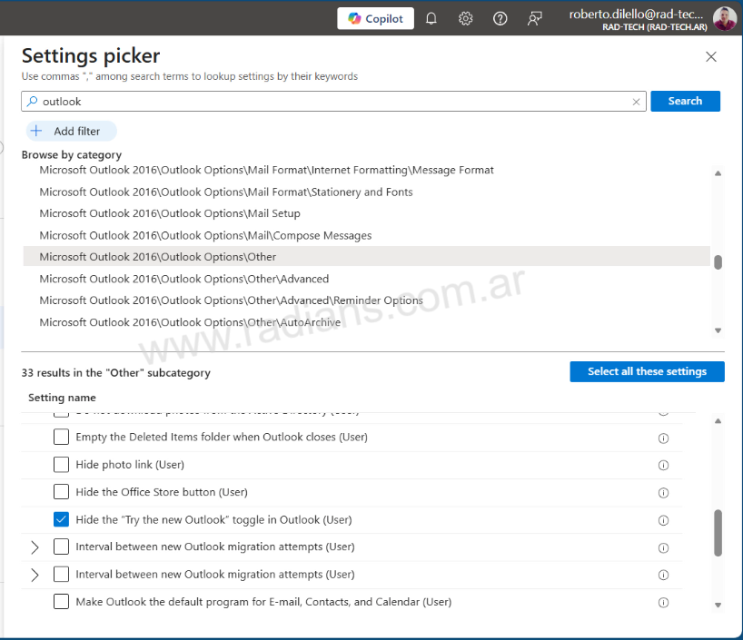 - En Ajustes de configuración : hacemos clic en + Agregar ajustes . En el selector de ajustes, buscamos “Outlook”. Luego buscamos la categoría “Microsoft Outlook 2016\Opciones de Outlook\Otros” y en la parte de “Settings Name” buscamos “Ocultar el interruptor “Probar la nueva configuración de Outlook” en Outlook (Usuario)”.