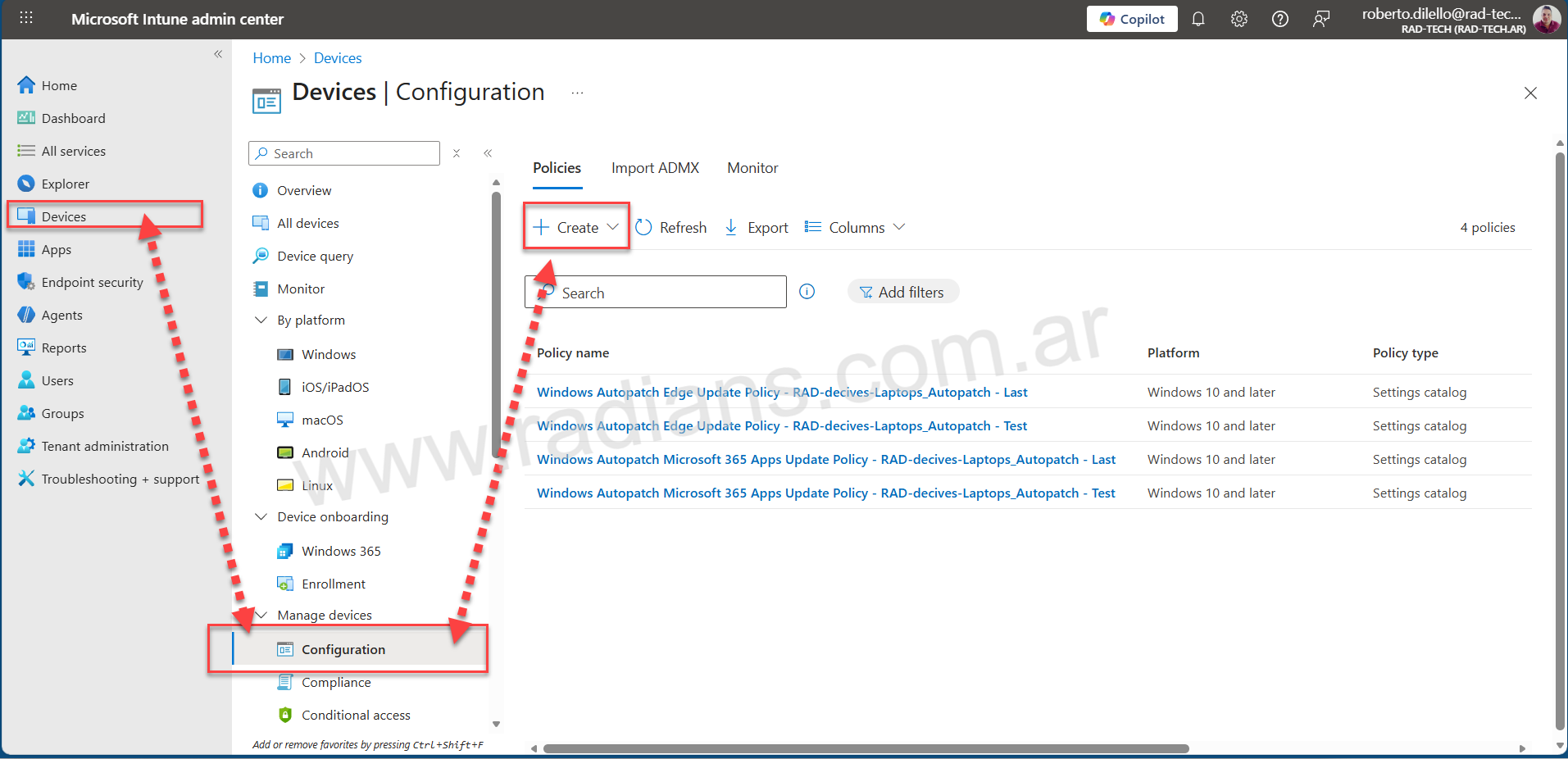 - Inicie sesión en el centro de administración de Intune https://intune.microsoft.com/ > Dispositivos > Configuración + Crear > Nueva política .