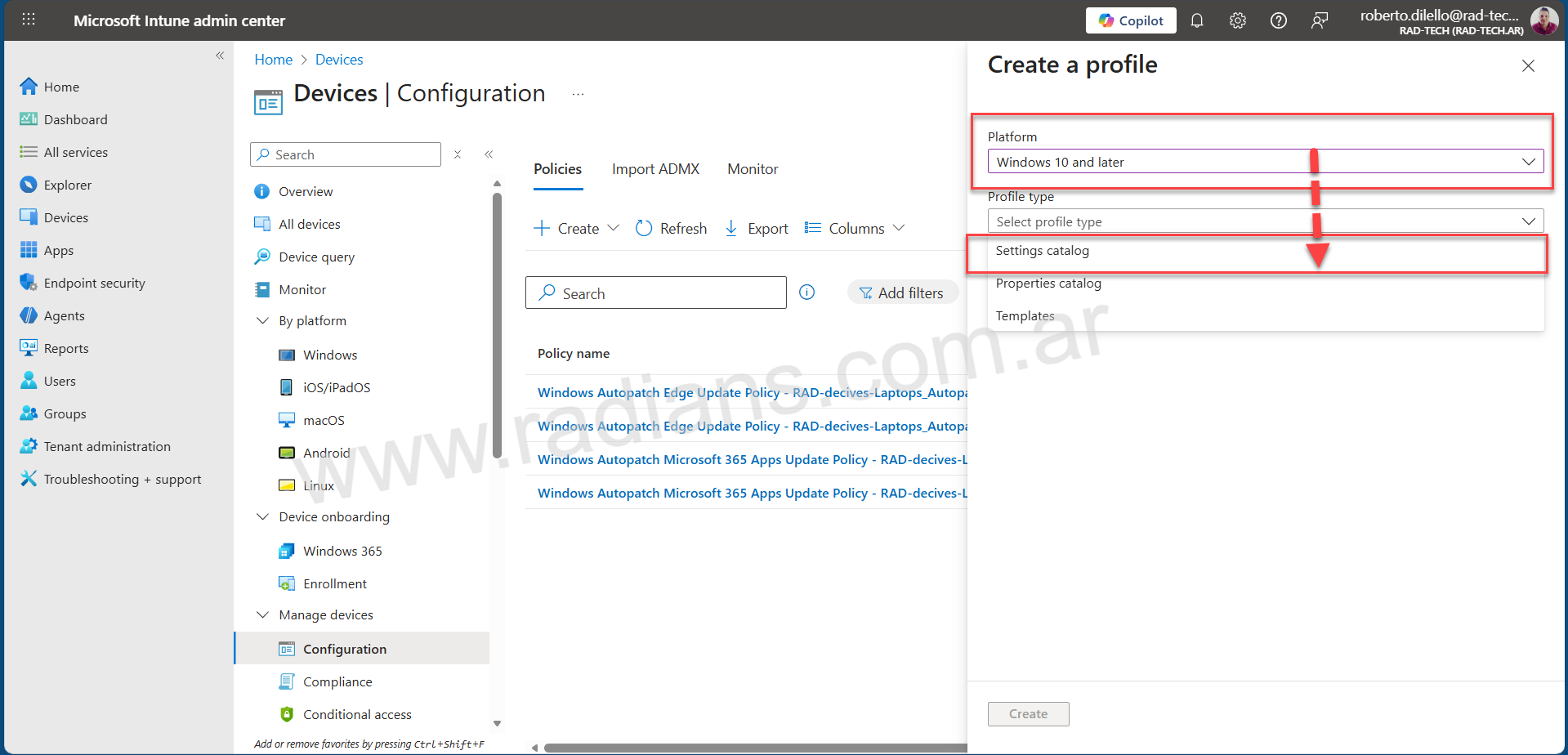 - Seleccione Plataforma como Windows 10 y posterior , Tipo de perfil como Catálogo de configuraciones , haga clic en Crear .