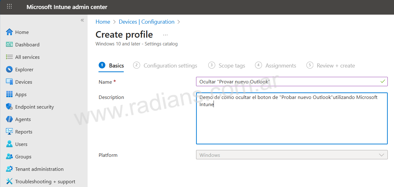 Obviamente, tambien podemos hacerlo con Microsoft Intune creando una nueva politica de configuracion y asignandola los dispositivos o a los usuarios. Los pasos para crear una política de Intune:
