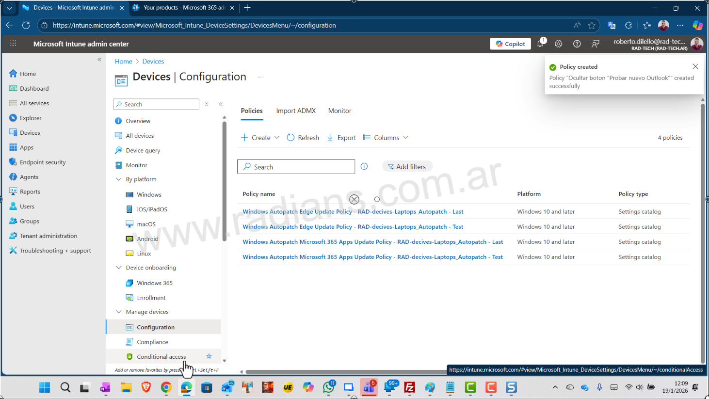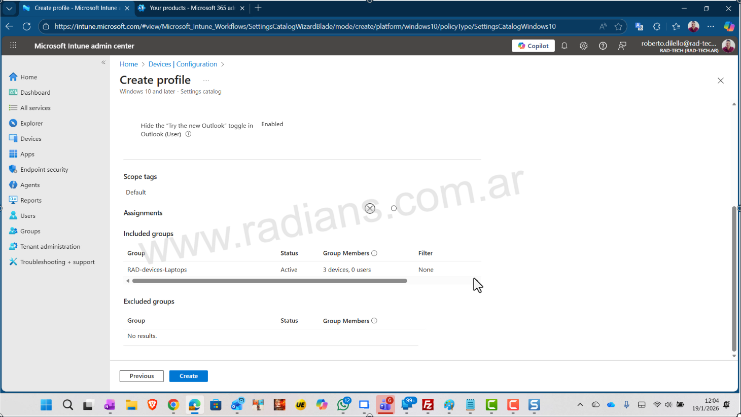 - Luego seleccionamos el nombre del grupo al cual se le va a aplical el profile, en nuestro caso RAD-devices-laptops que contiene a todas las laptops de nuestro tenant.