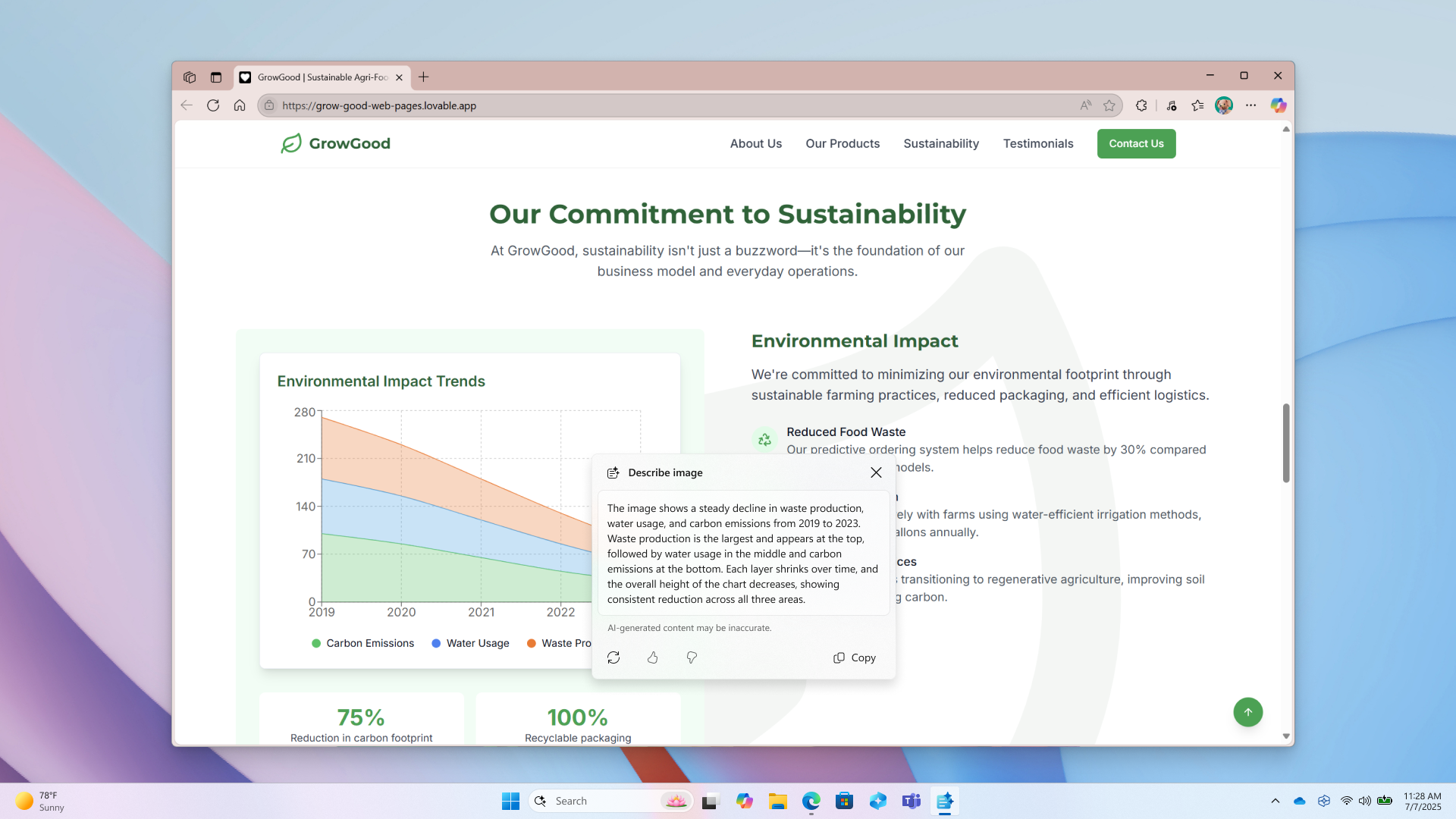 Presentamos una nueva acción llamada “Describir imagen” en Click to Do para obtener descripciones detalladas de imágenes, gráficos y diagramas, lo que resulta útil para obtener una visión general rápida del contenido visual. La primera vez que utilice esta acción, se configurarán los modelos necesarios y las descripciones se generarán localmente en su dispositivo, garantizando así que sus datos confidenciales permanezcan en su PC. Esta función está diseñada para mejorar la accesibilidad y puede ser utilizada por cualquier persona en situaciones como obtener una visión general rápida de un gráfico o diagrama, generar texto alternativo para los elementos que cree, etc.