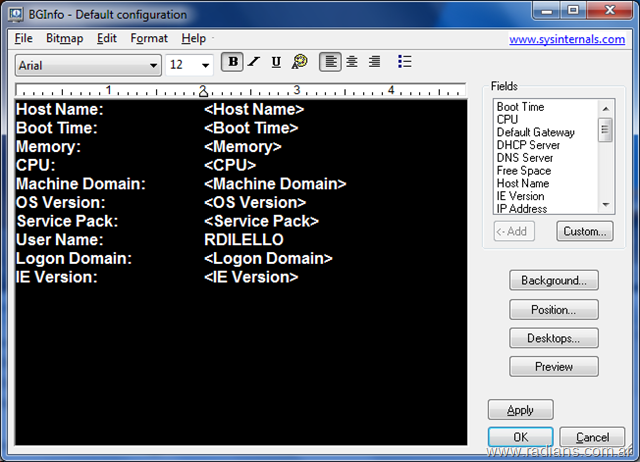 BGInfo simplemente escribe un nuevo BMP (mapa de bits) y no consume recursos del sistema o la interferencia con otras aplicaciones. Podemos configurar varias cosas, como ser: donde se va a mostrar (la posición en la pantalla), el color de fondo, distintas variables a mostrar, tenemos opciones para usuarios de terminal server, etc.