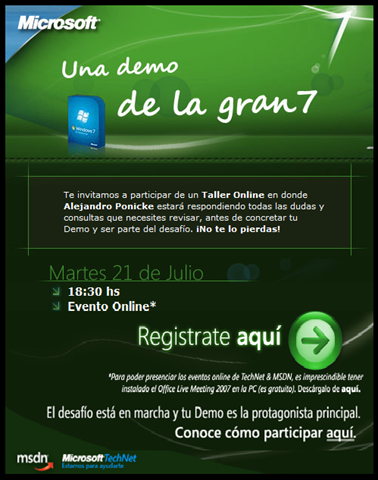 Quería invitarlos a participar de este evento a cargo de Alejandro Ponicke sobre Windows 7. aprovechen esta oportunidad y participen!!! (el link de registro se encuentra al final).