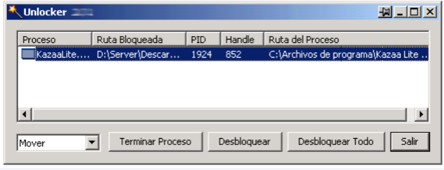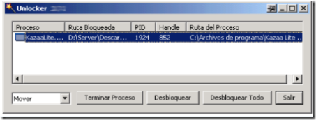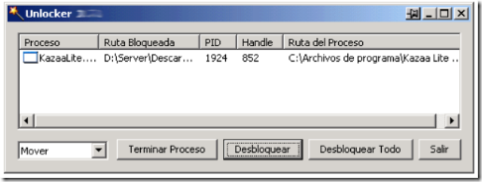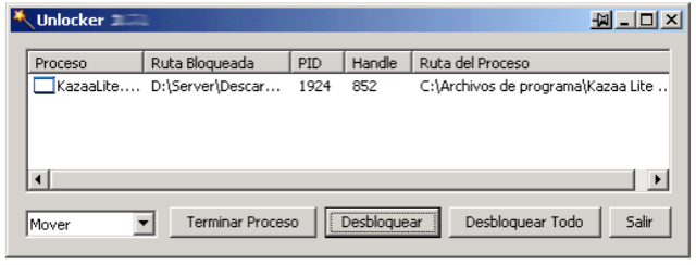 - Ahora seleccione (para seleccionar varios, use SHIT+click ó CTRL+click) el proceso que está bloqueando nuestro archivo ó carpeta y de click en el boton “Desbloquear” o “Desbloquear Todo” si queremos desbloquear y eliminar todos los archivos de la lista de procesos bloqueados.
